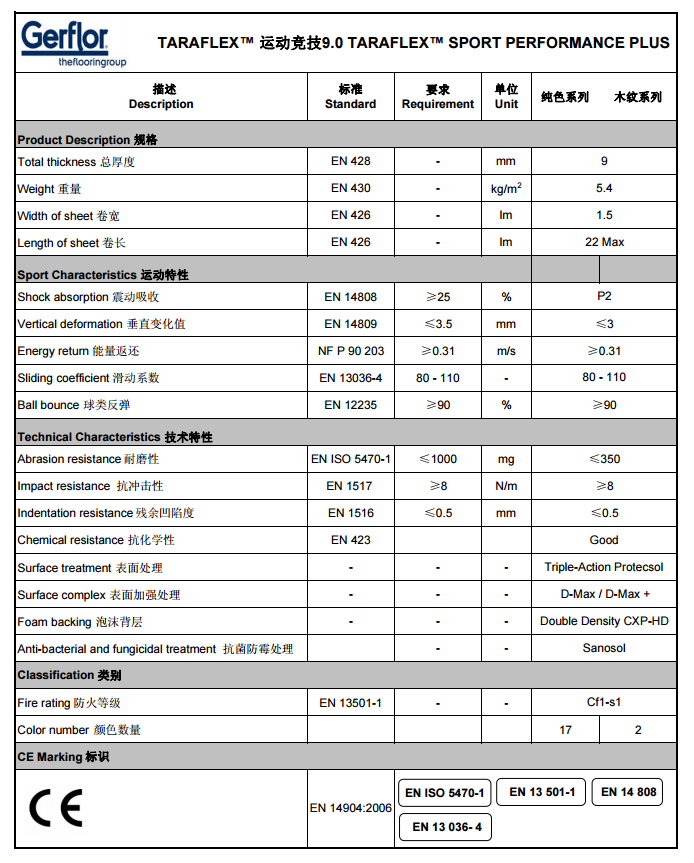 內(nèi)運動地板的標(biāo)準(zhǔn)NFP 90 203和標(biāo)準(zhǔn)NF EN 14-904。該產(chǎn)品經(jīng)過處 理(防污,防灼熱擦傷,防阻滯且防滑),同時