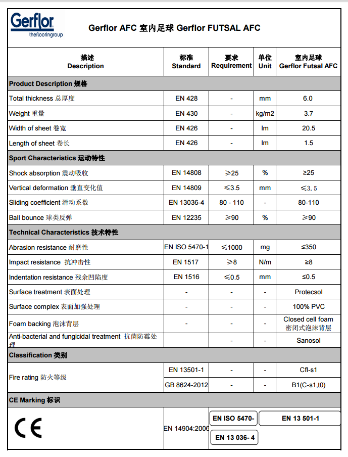 潔福AFC室內足球地板,全新的潔福室內足球地板,共有2個顏色,為室內足球的標準紅藍二色。厚度 6.0mm。表面為PROTECSOL特殊維護處理,耐臟抗污,易于養護。產品中加入了 Sanosol技術,持久抑菌防霉。