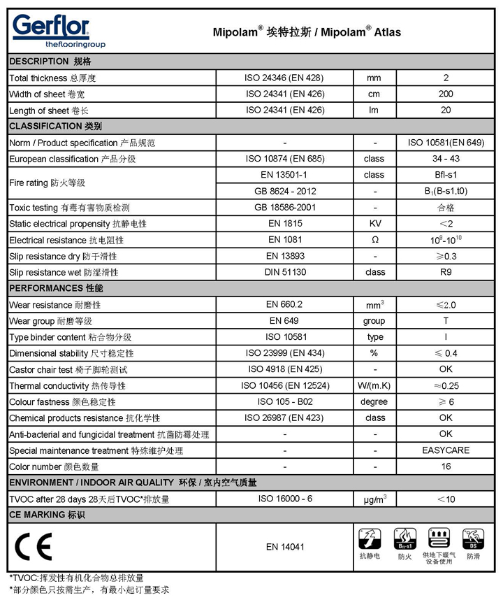 MIPOLAM?埃特拉斯具有抗菌和防霉的特點(diǎn)。該地板符合 EN 649 (34 - 43) 項(xiàng)規(guī)定,其耐磨性達(dá)到 Group T 的標(biāo)準(zhǔn),適合于人多量大的地方使用的。