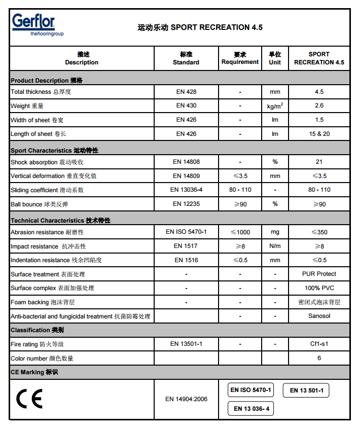 活動區、學校綜合體育館等.運動樂動 4.5 產品經過聚氨酯紫外線光固化(PUR Protect)處理,具有優異的耐用性能。