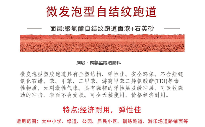 由于產品表面采用顆粒與聚氨脂膠粘劑混合后噴涂,不會產生脫離現象。表面耐磨性強。能滿足學*長時間,高頻率教學使用,而且價格低廉,所以非常適合中小*校鋪設。