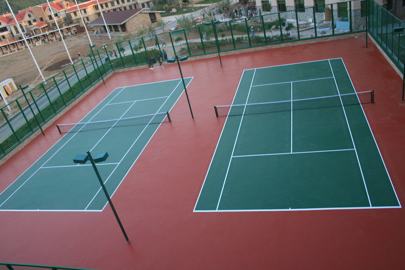 這是一種現(xiàn)場(chǎng)澆鋪用刮板制作在瀝青混凝土上或鋼盤(pán)混凝土結(jié)構(gòu)地面上的型材,其工藝主要分為找平結(jié)合層、加強(qiáng)層、耐磨層等多層做法,還有含膠粒的多層做法這種面層材料及工藝的優(yōu)點(diǎn)是平整度高、表面硬度高、耐磨、抗曬、色澤鮮艷、使用壽命長(zhǎng)便于管理和維修。這種面層材質(zhì)穩(wěn)定的網(wǎng)球場(chǎng)近年來(lái)已開(kāi)始在**各地普遍采用,管它球速稍快,較之其它類(lèi)型球場(chǎng),球的彈跳平衡,球員場(chǎng)上跑動(dòng)舒服,是一種既可供娛樂(lè)打球也可用做正規(guī)比賽的**次網(wǎng)球場(chǎng)地